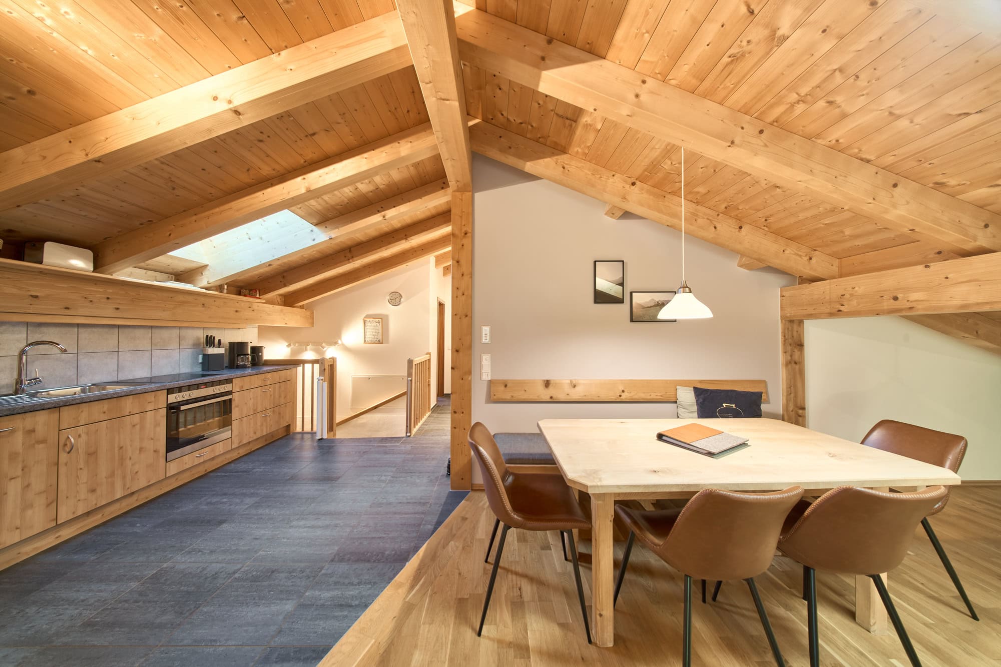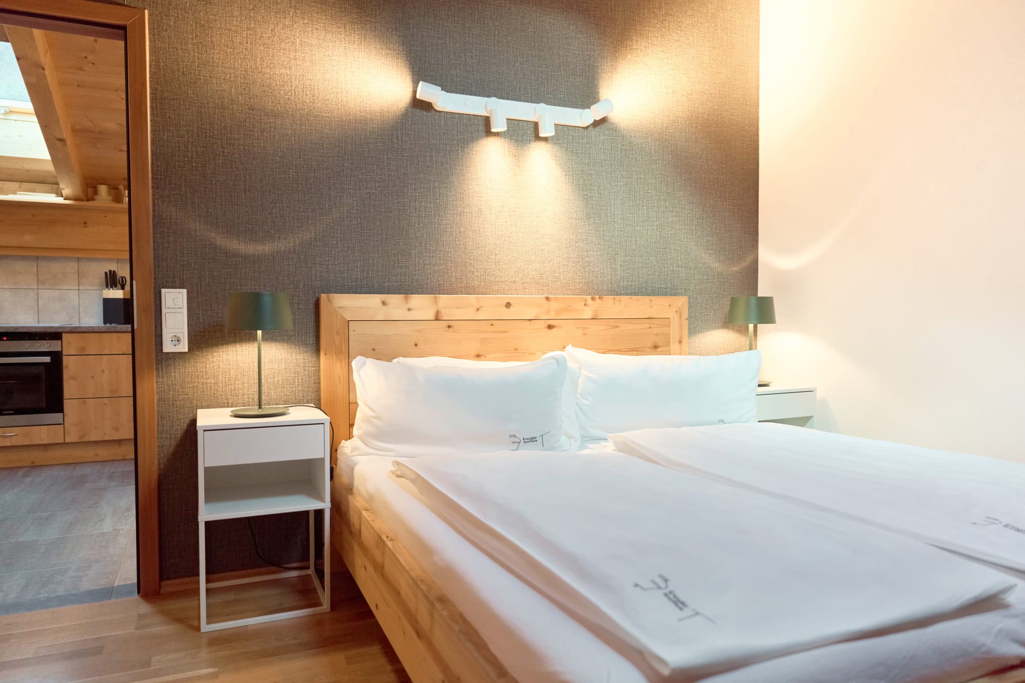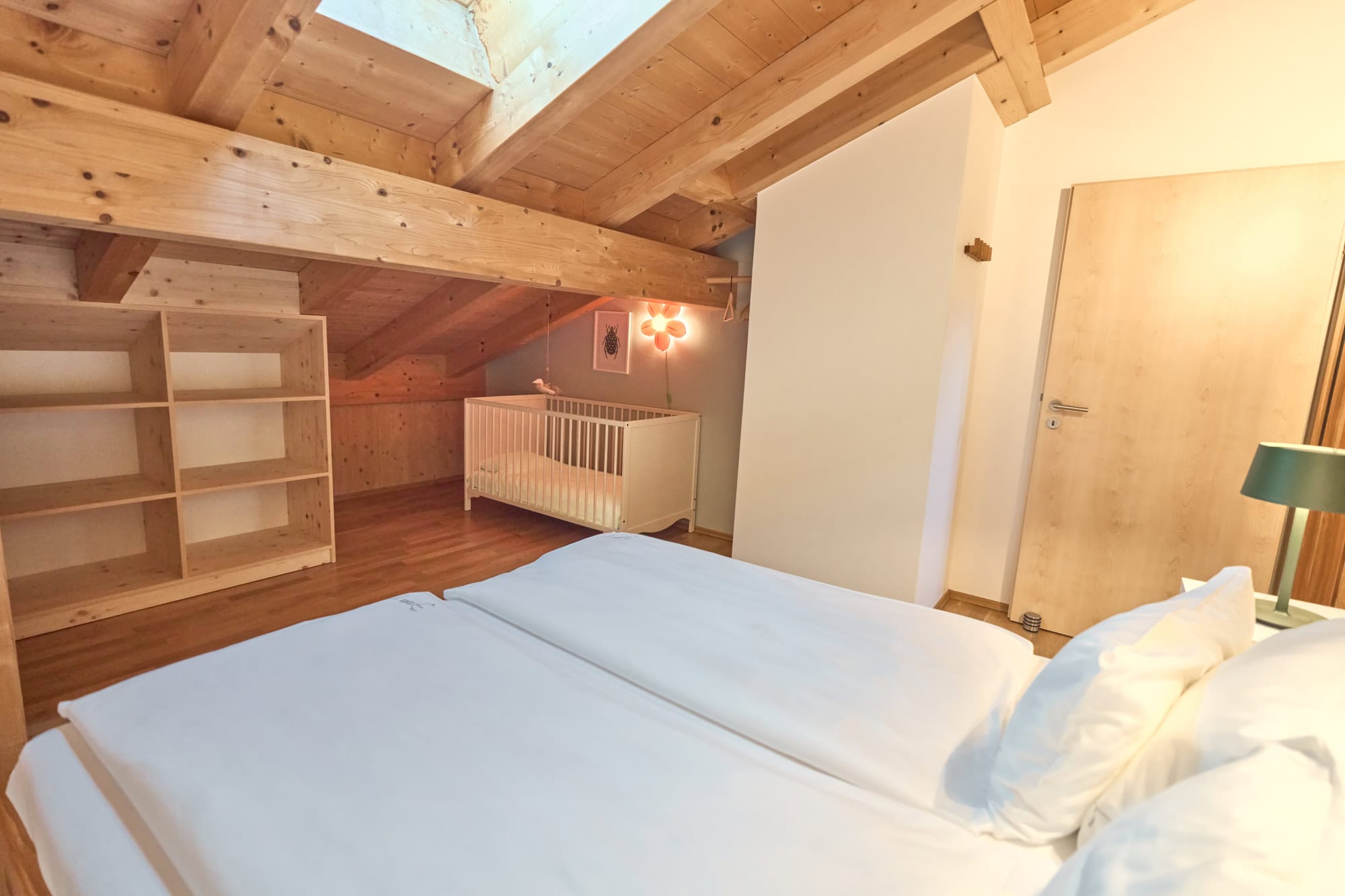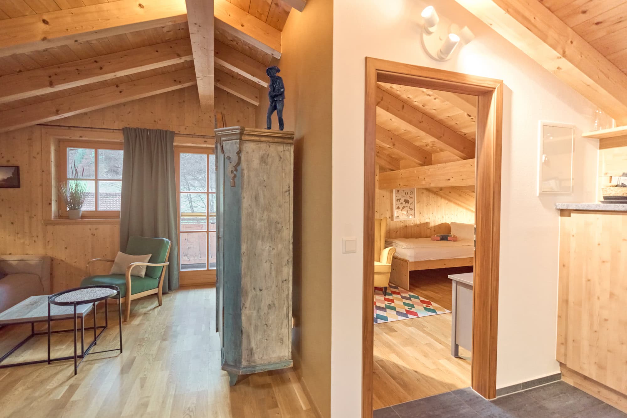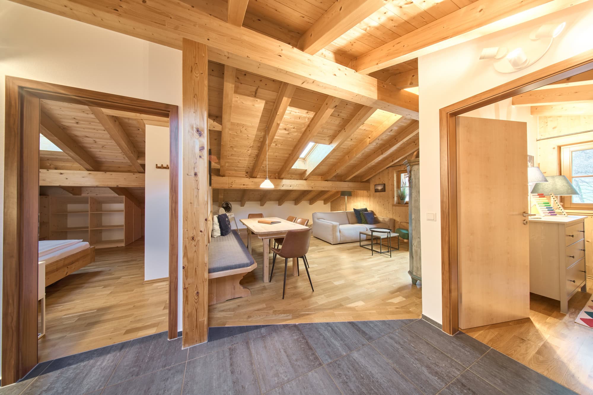 Mit je einem Eltern- und einem Kinderschlafzimmer ist unsere helle Ferienwohnung Geigelstein perfekt für Familien geeignet. Hier ist es so geräumig, dass sich jeder wohlfühlen und entspannen kann – alle gemeinsam oder jeder für sich.