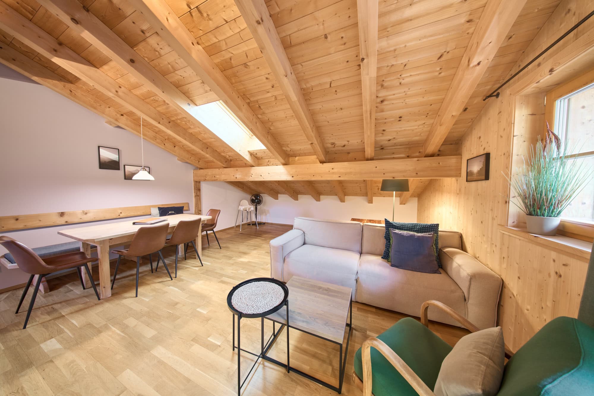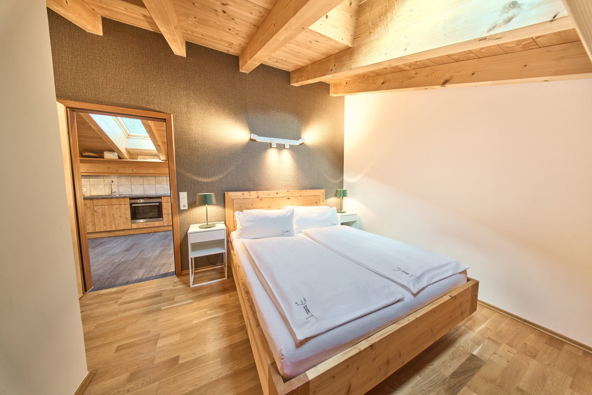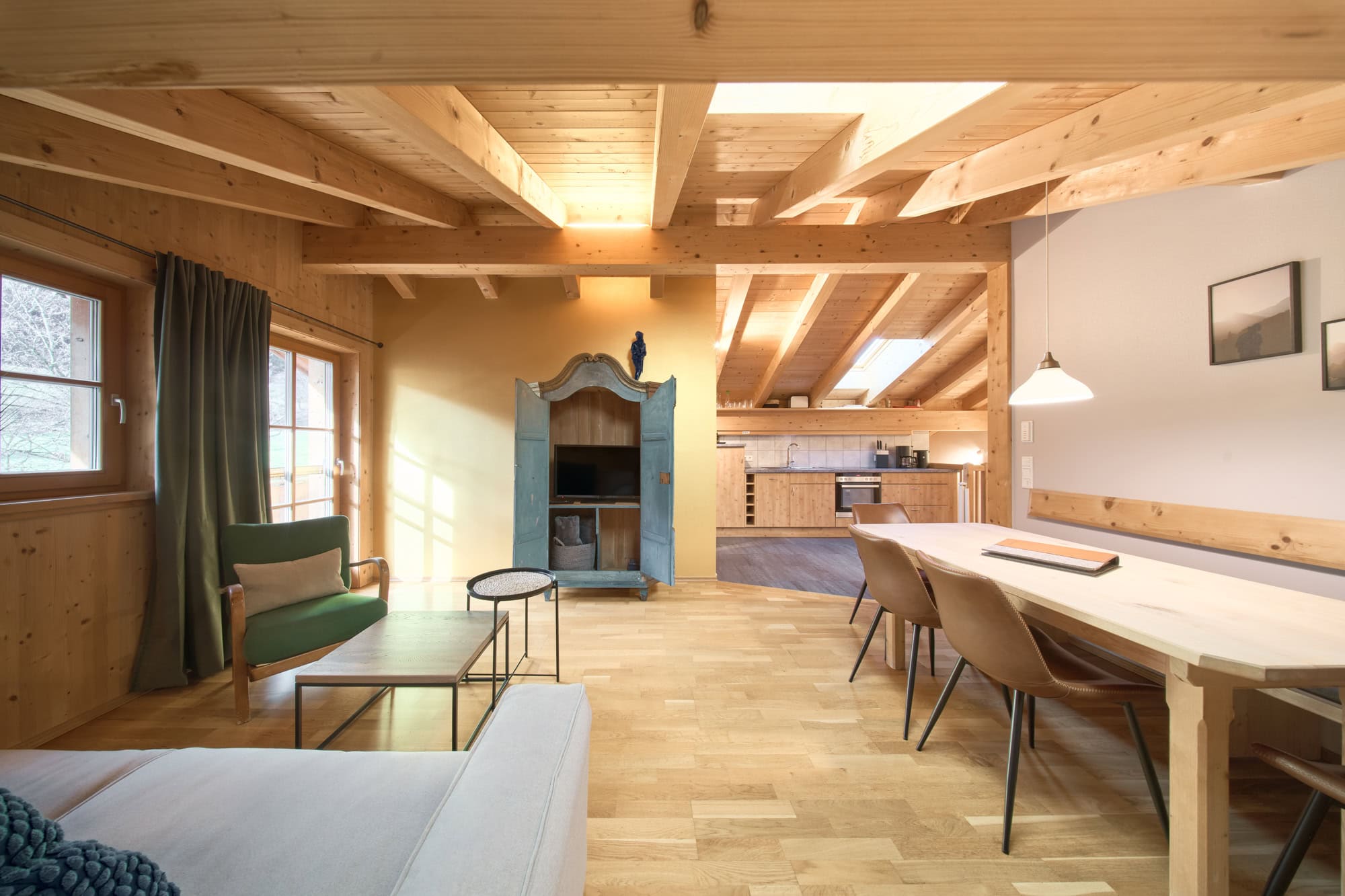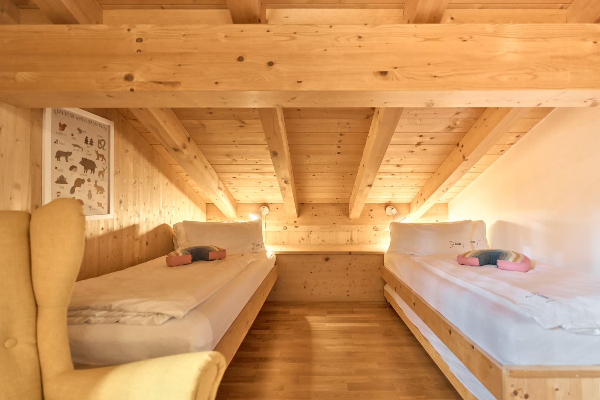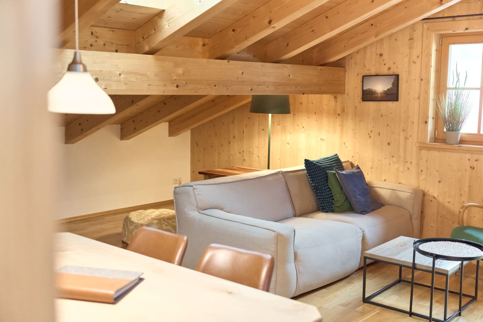 Mit je einem Eltern- und einem Kinderschlafzimmer ist unsere helle Ferienwohnung Geigelstein perfekt für Familien geeignet. Hier ist es so geräumig, dass sich jeder wohlfühlen und entspannen kann – alle gemeinsam oder jeder für sich.