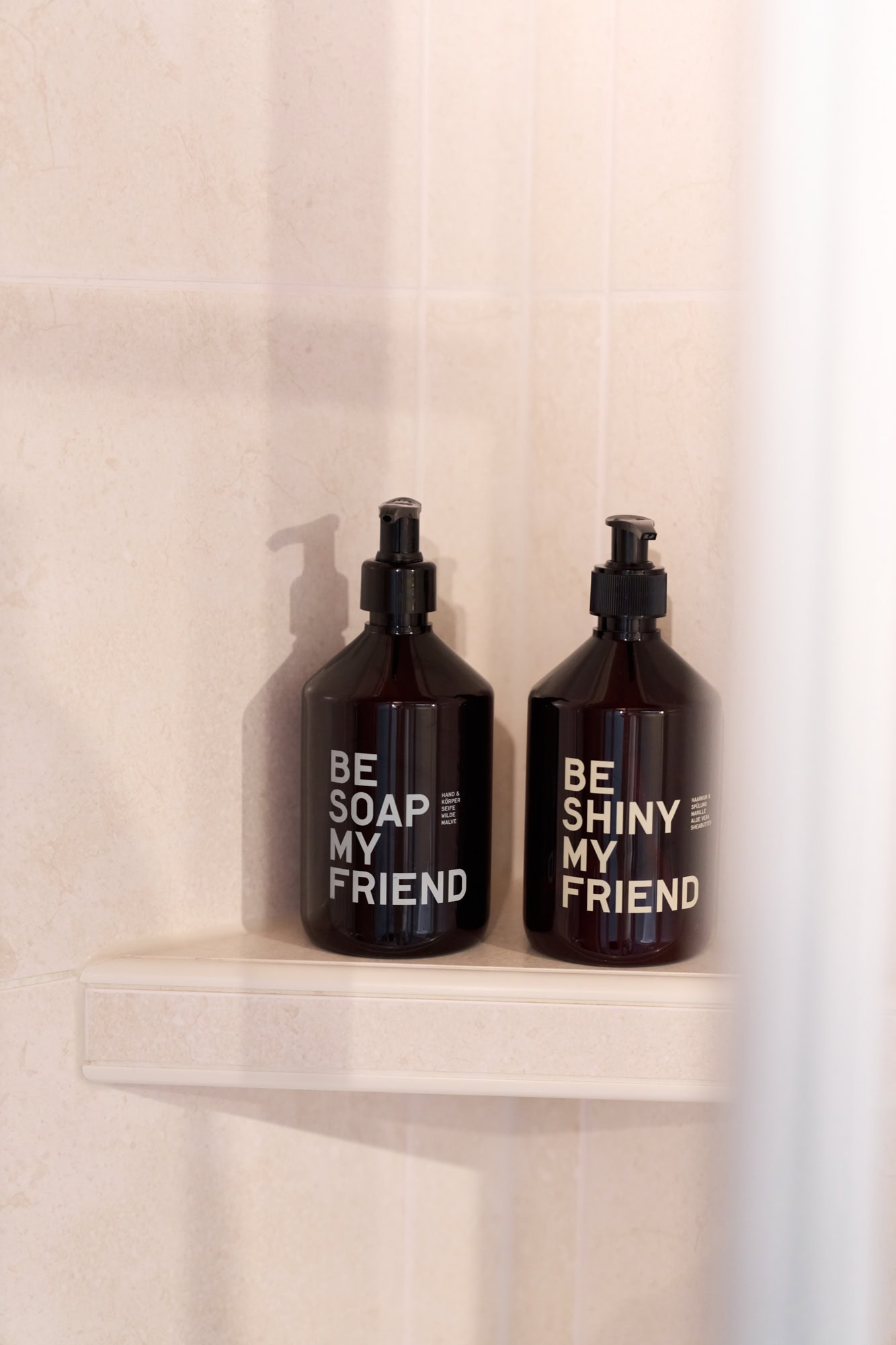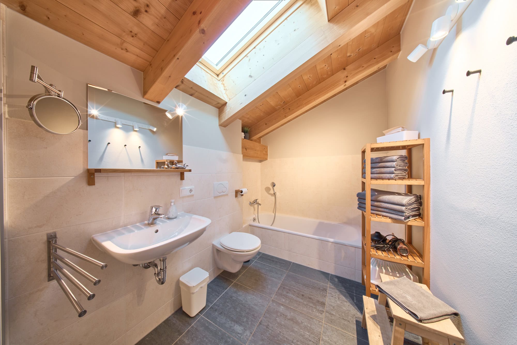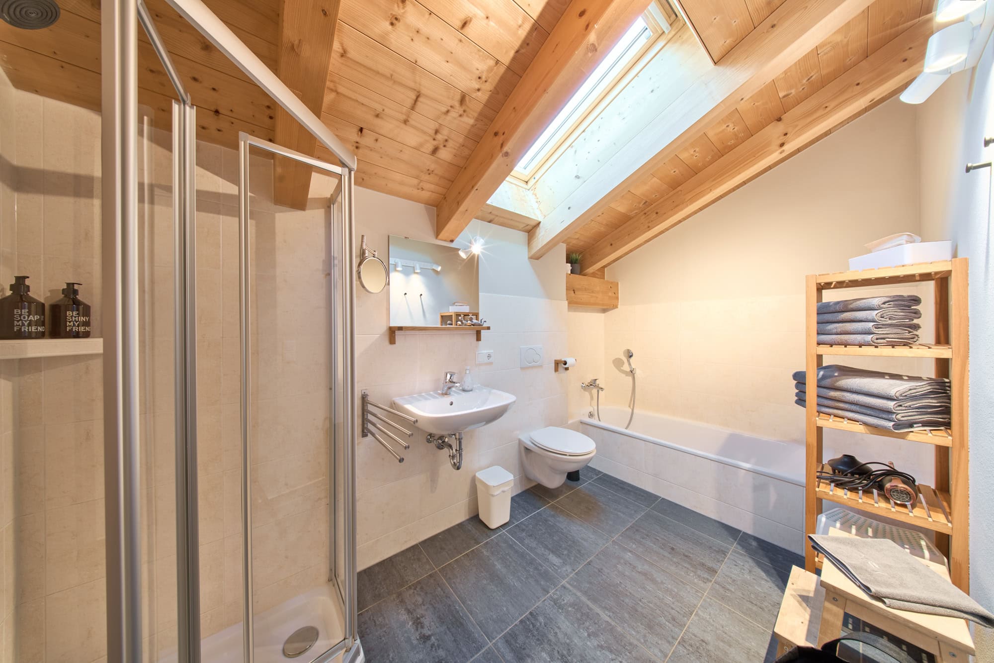 - Bad mit WC, Dusche, Badewanne und kleinem Hocker zum Zähneputzen sowie einem Föhn
